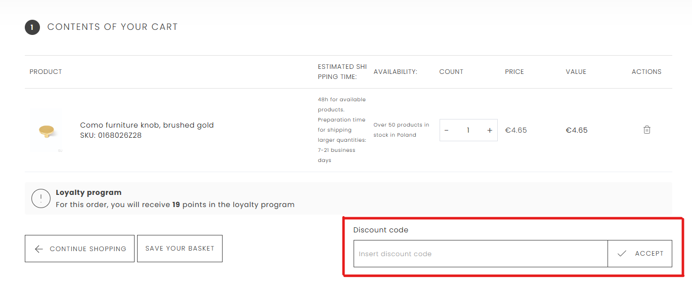 4) If you have received a discount code, enter it in the "discount code" field and click "ACCEPT".