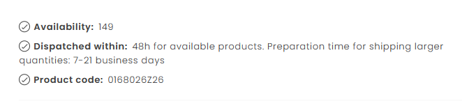 This is an estimated time for dispatching an order from our warehouse. It may be extended in the case of product unavailability or ordering a larger quantity than the stated availability. Products will then be ordered from the manufacturer's warehouse.