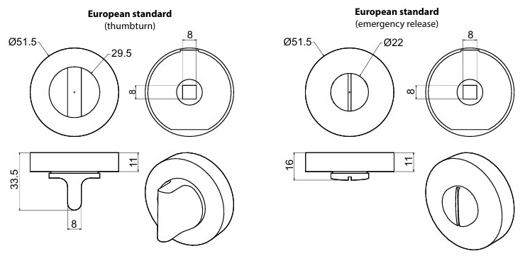 Notre offre comprend des serrures de salle de bain Helix 200 conformes aux normes européennes et scandinaves. Ces normes diffèrent par l'épaisseur de la tige de fixation, ainsi que par la hauteur et la largeur des trous de fixation de la serrure à la porte.