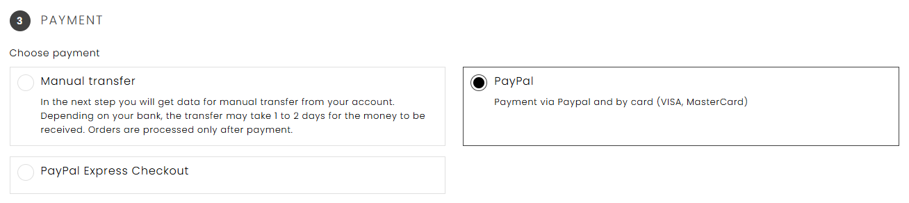 Pour les commandes en ligne, nous proposons deux types d'options de paiement PayPal (paiement standard et paiement express) ainsi que des virements manuels.