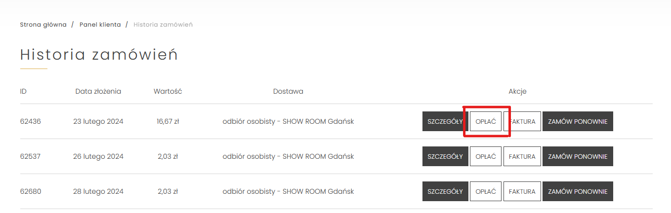 c) Nacisnąć "OPŁAĆ" przy wybranym zamówieniu: